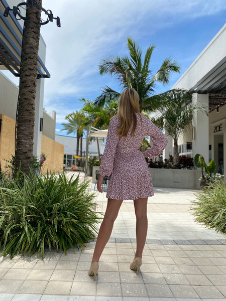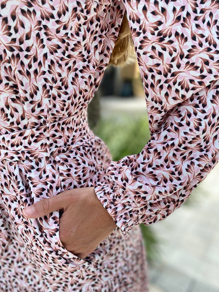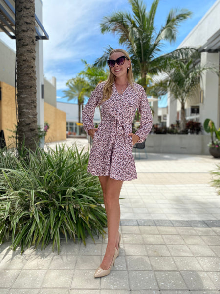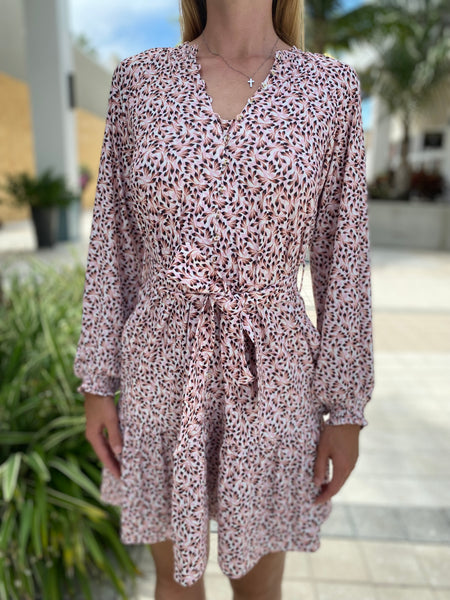 Matte jersey Smocked neck Buttons at front body are functional only at top & hem Tie belt at waist Above the knee length 35.5”