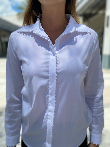 A timeless classic made from the finest cotton shirt a beautifully elegant structure. Whether teamed with a long skirt, suit or jeans, the neat collar and pearl lined collar and buttons panel create a well-groomed look.