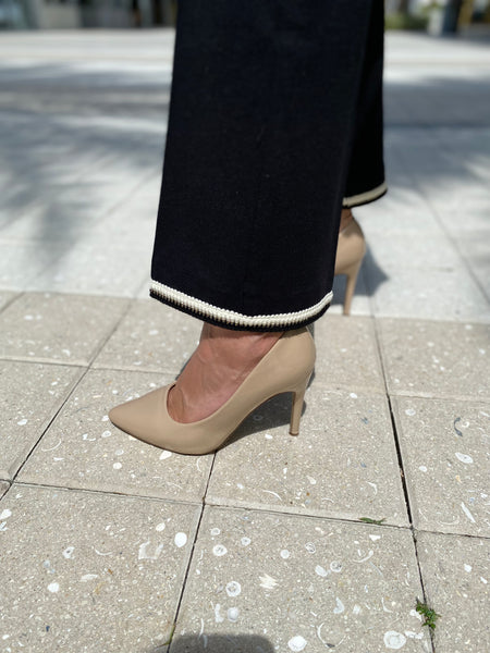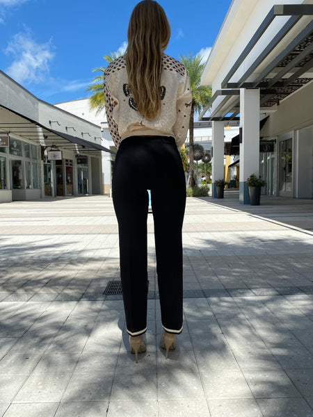 Black trousers with a trim on the hem. Perfect fit extra comfort knit fabric. Elastic waistband. Side pockets. Vilagallo pants cute white trim on the bottom. Faux pockets in the back. Evening or elegant afternoon pants.